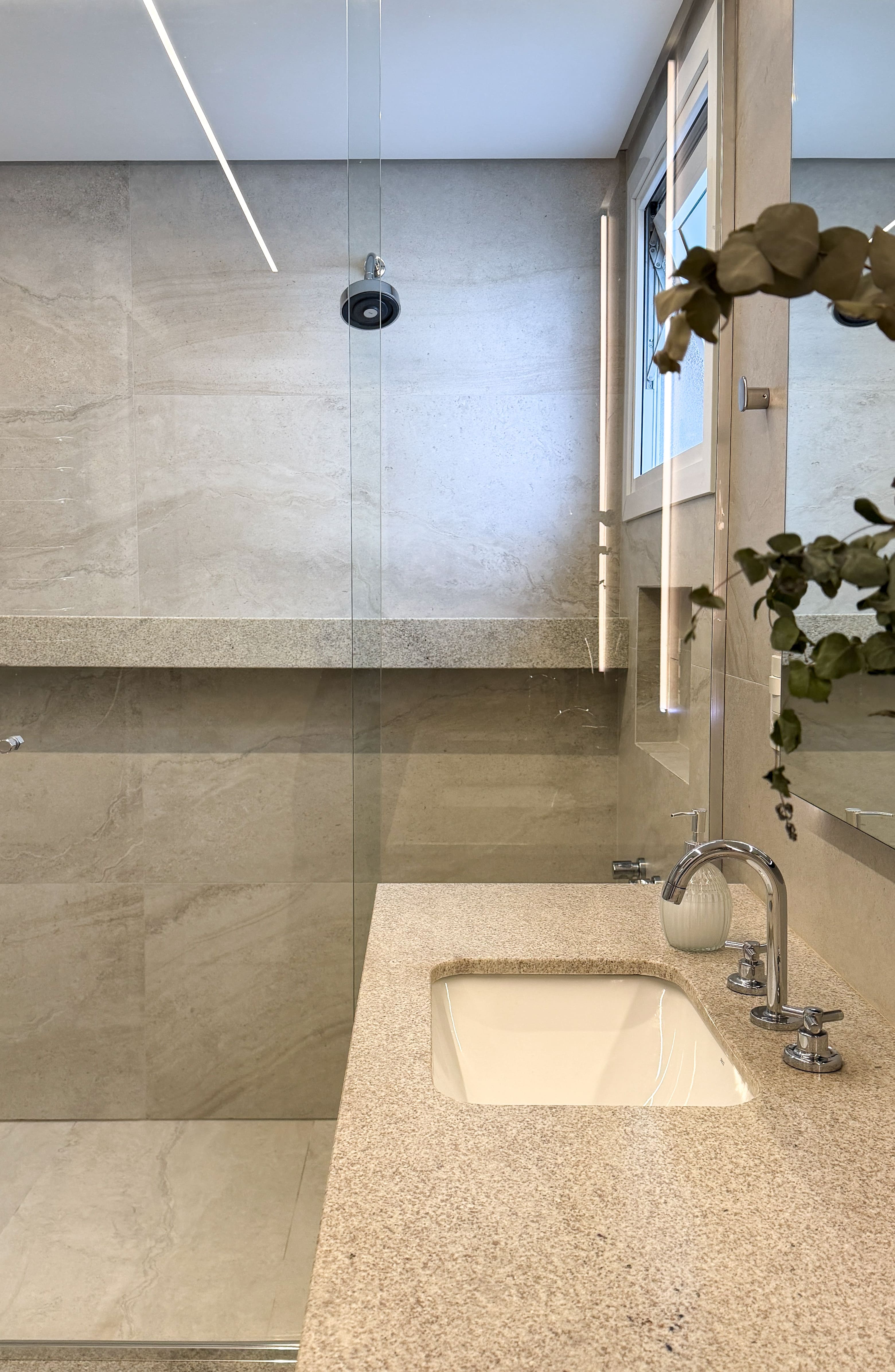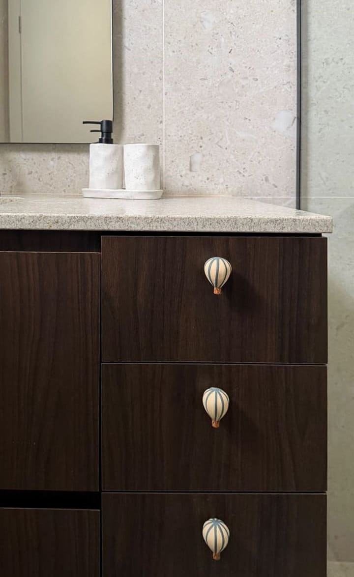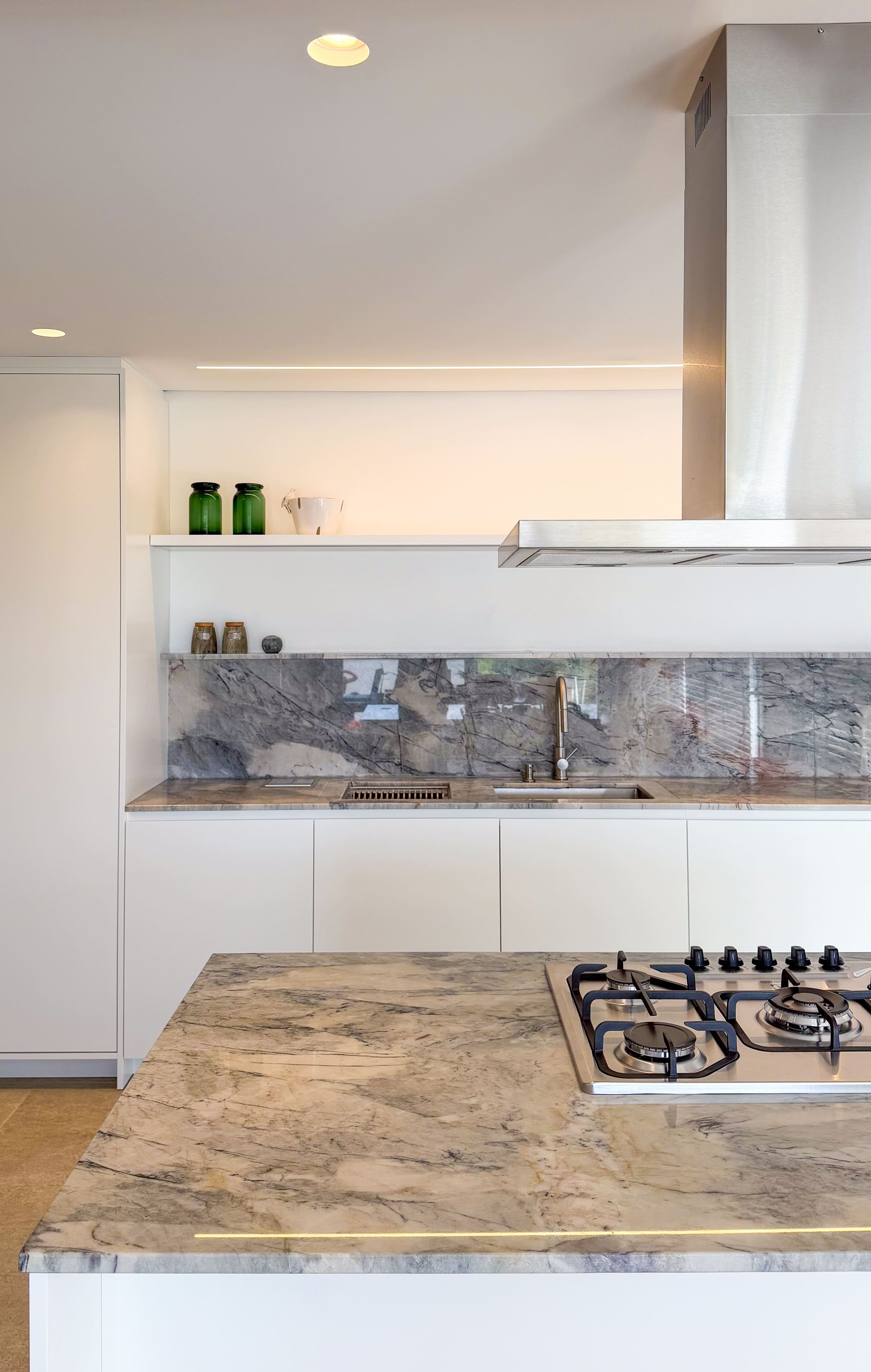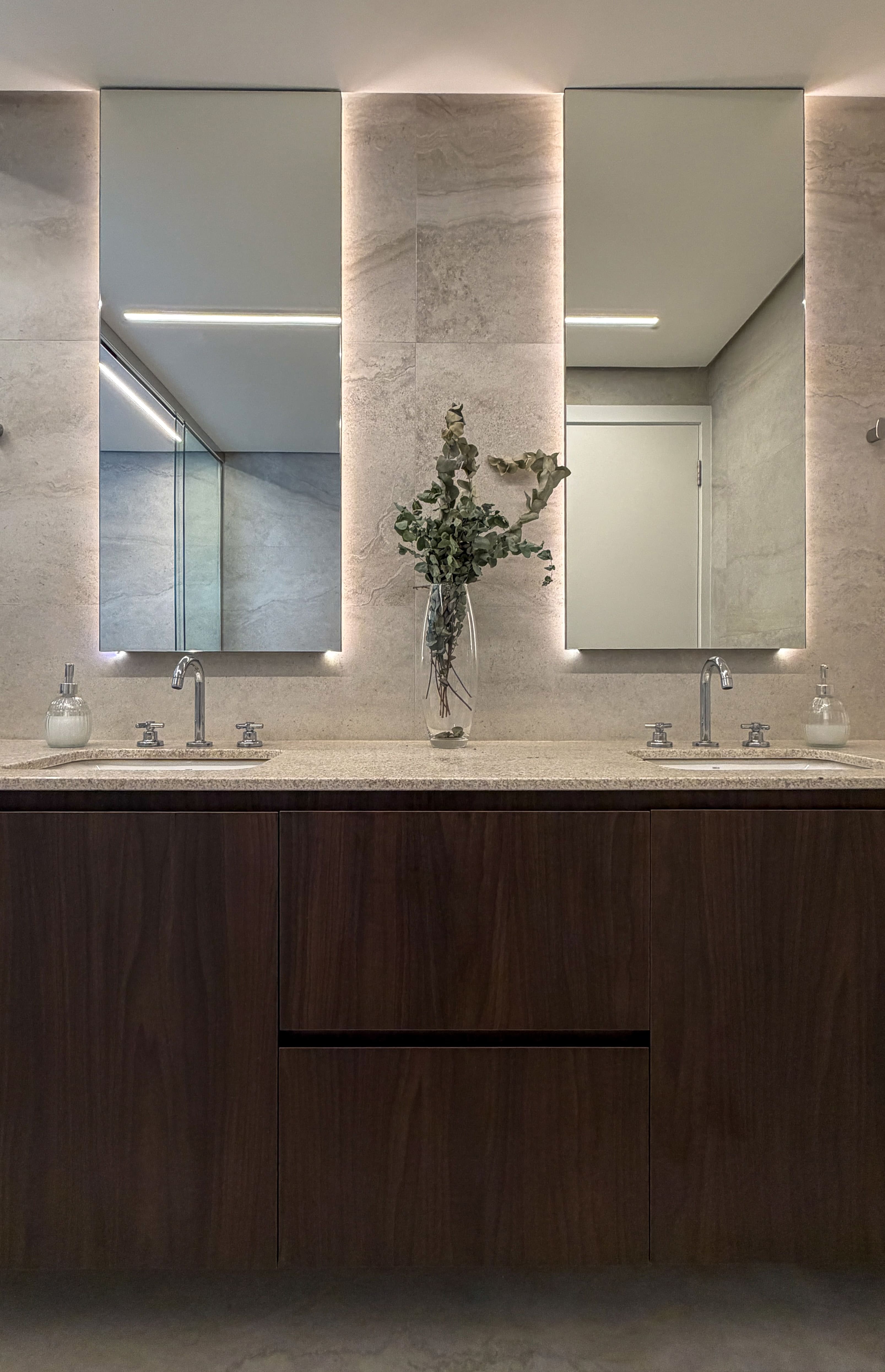 A escolha dos materiais, tons e materialidades foi desenvolvida de forma integrada, criando um conjunto coeso em que todos os ambientes da casa dialogam entre si.