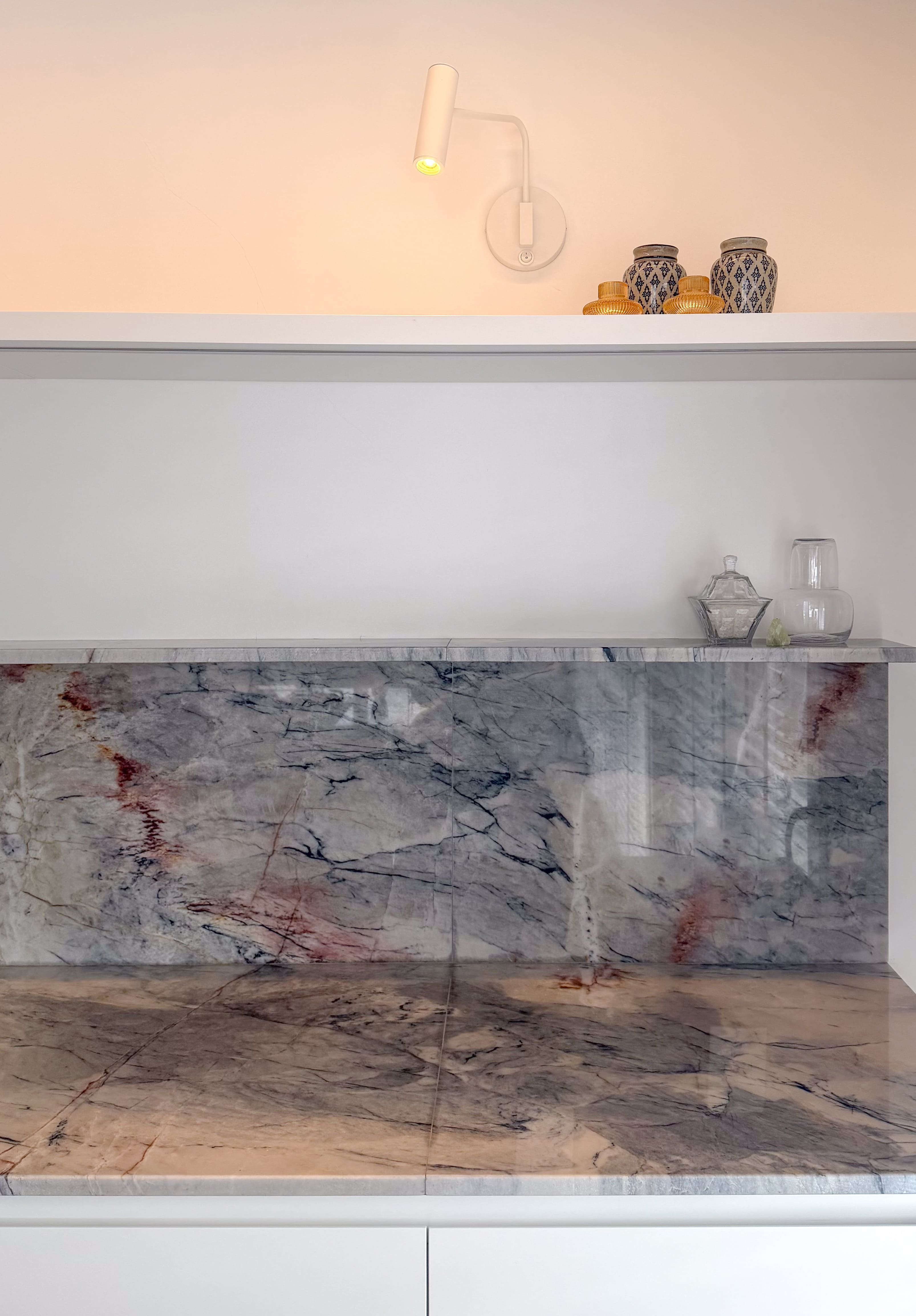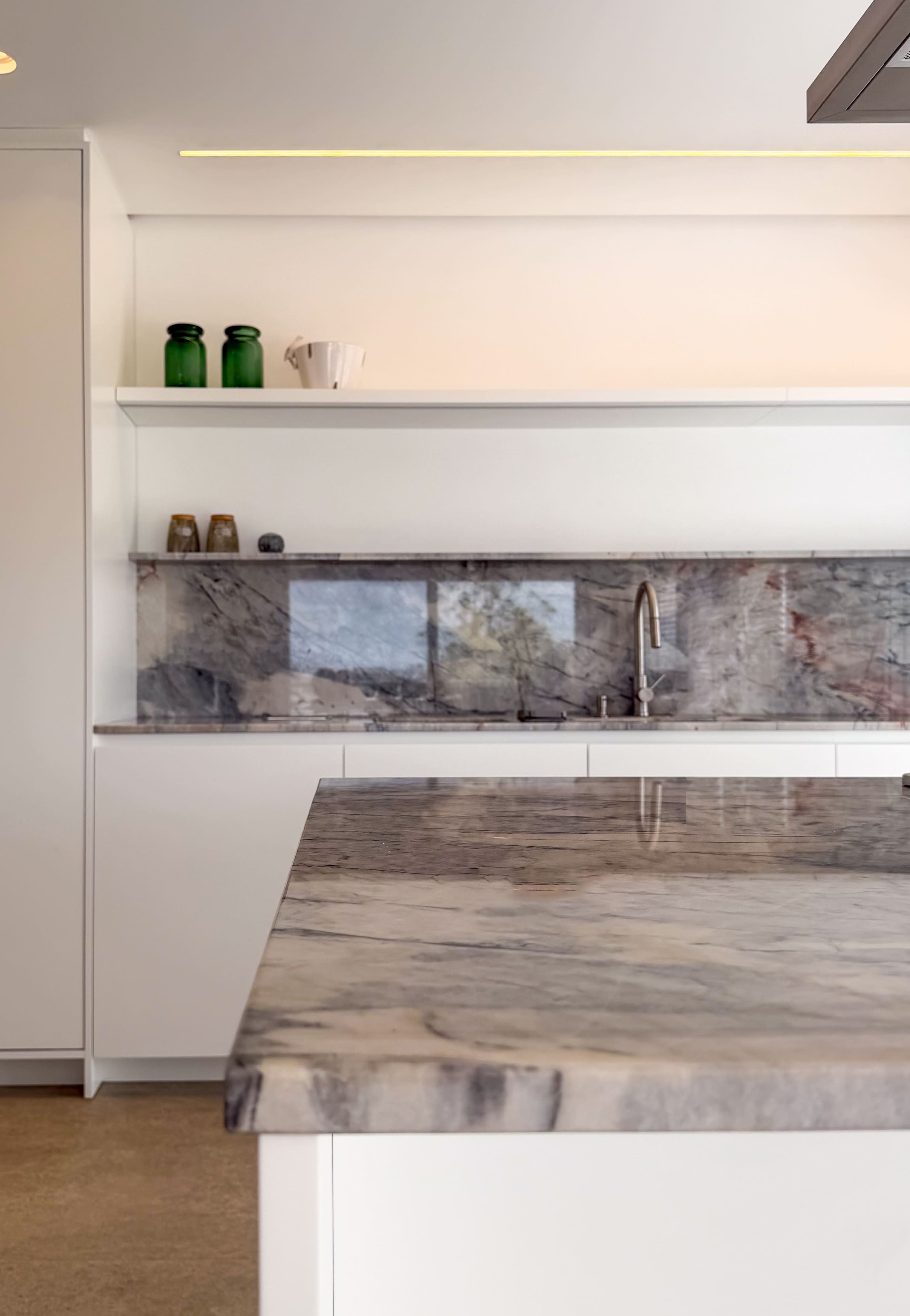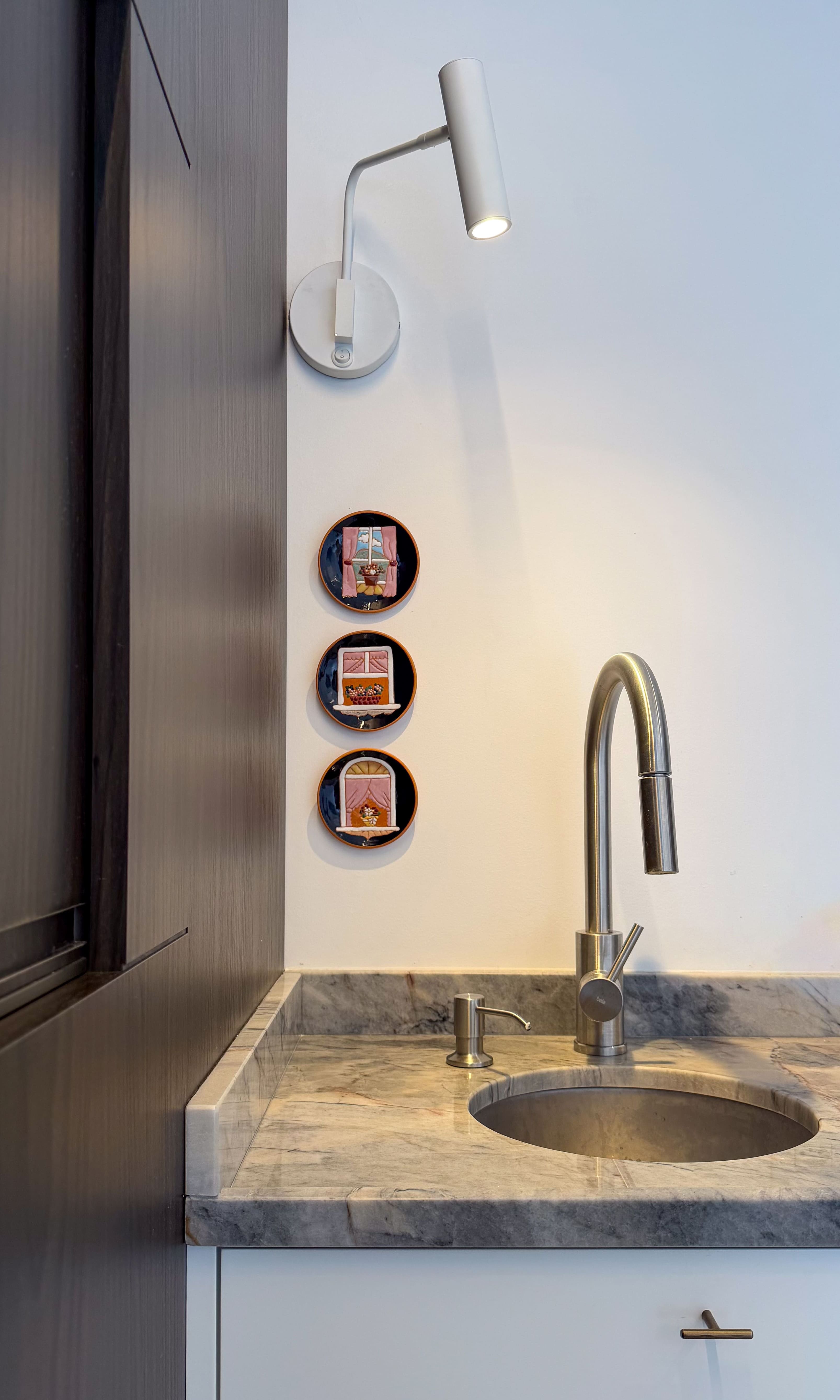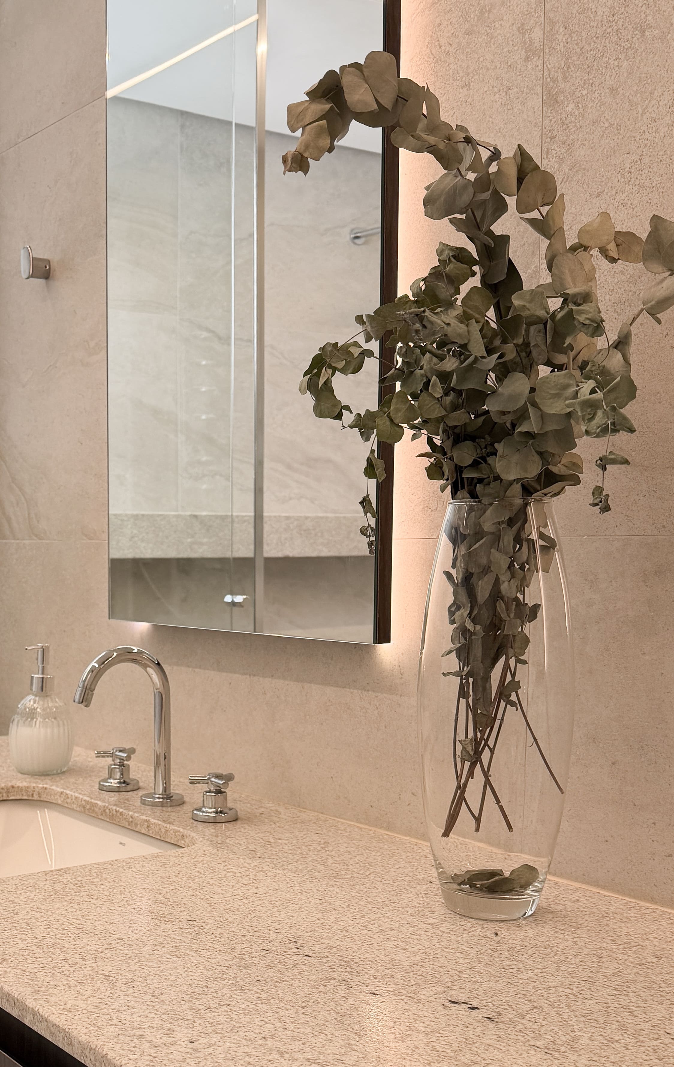 A escolha dos materiais, tons e materialidades foi desenvolvida de forma integrada, criando um conjunto coeso em que todos os ambientes da casa dialogam entre si.