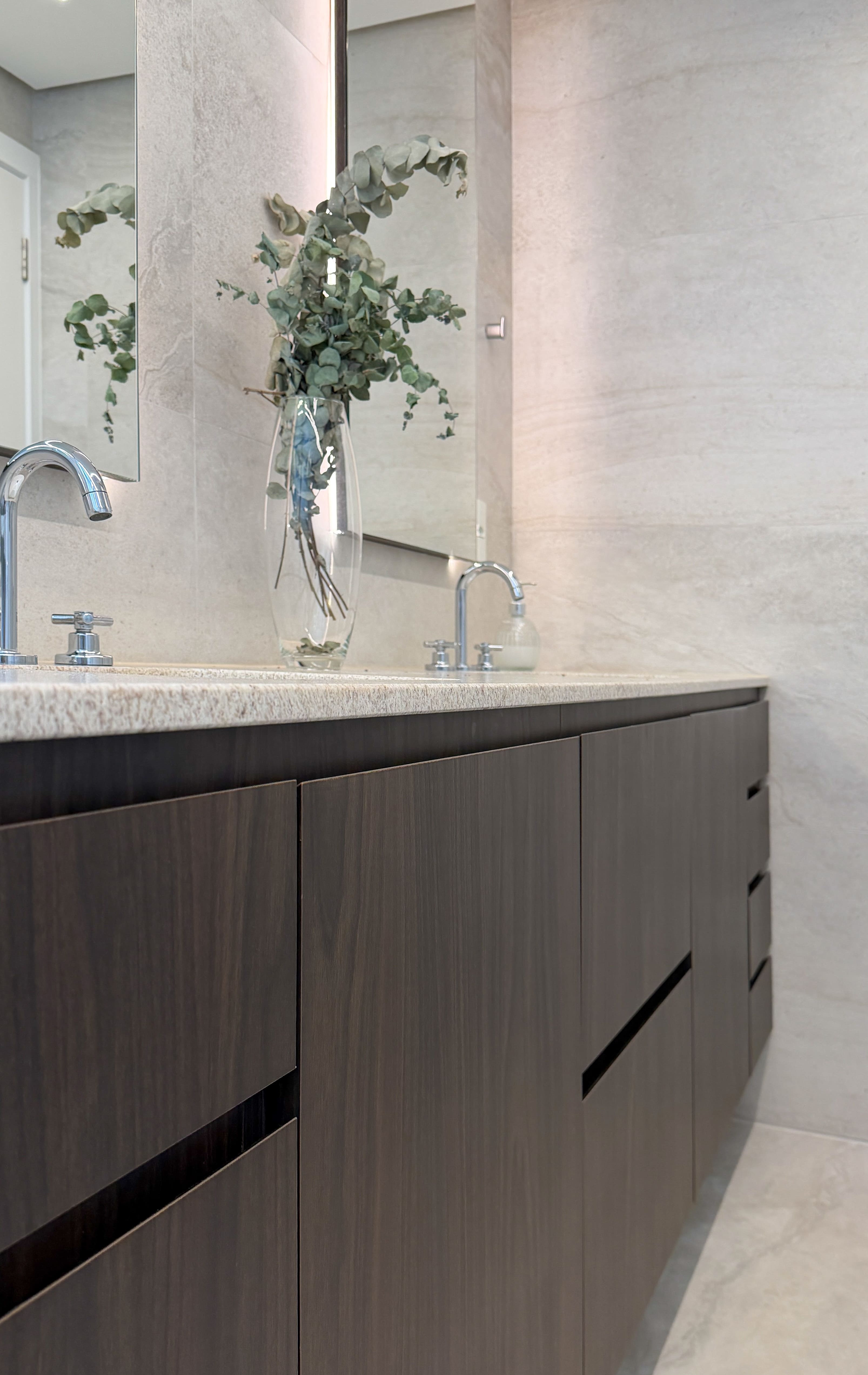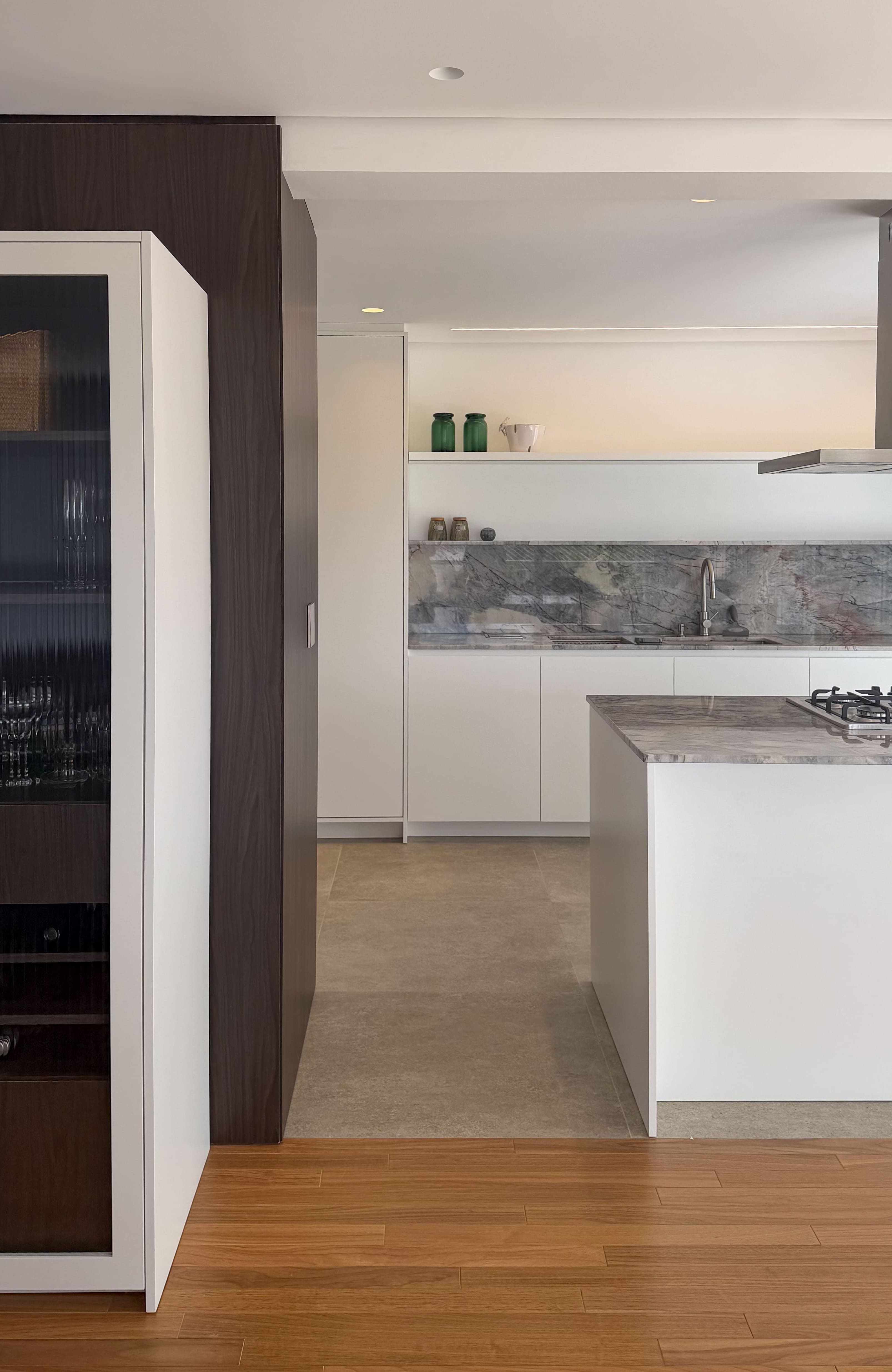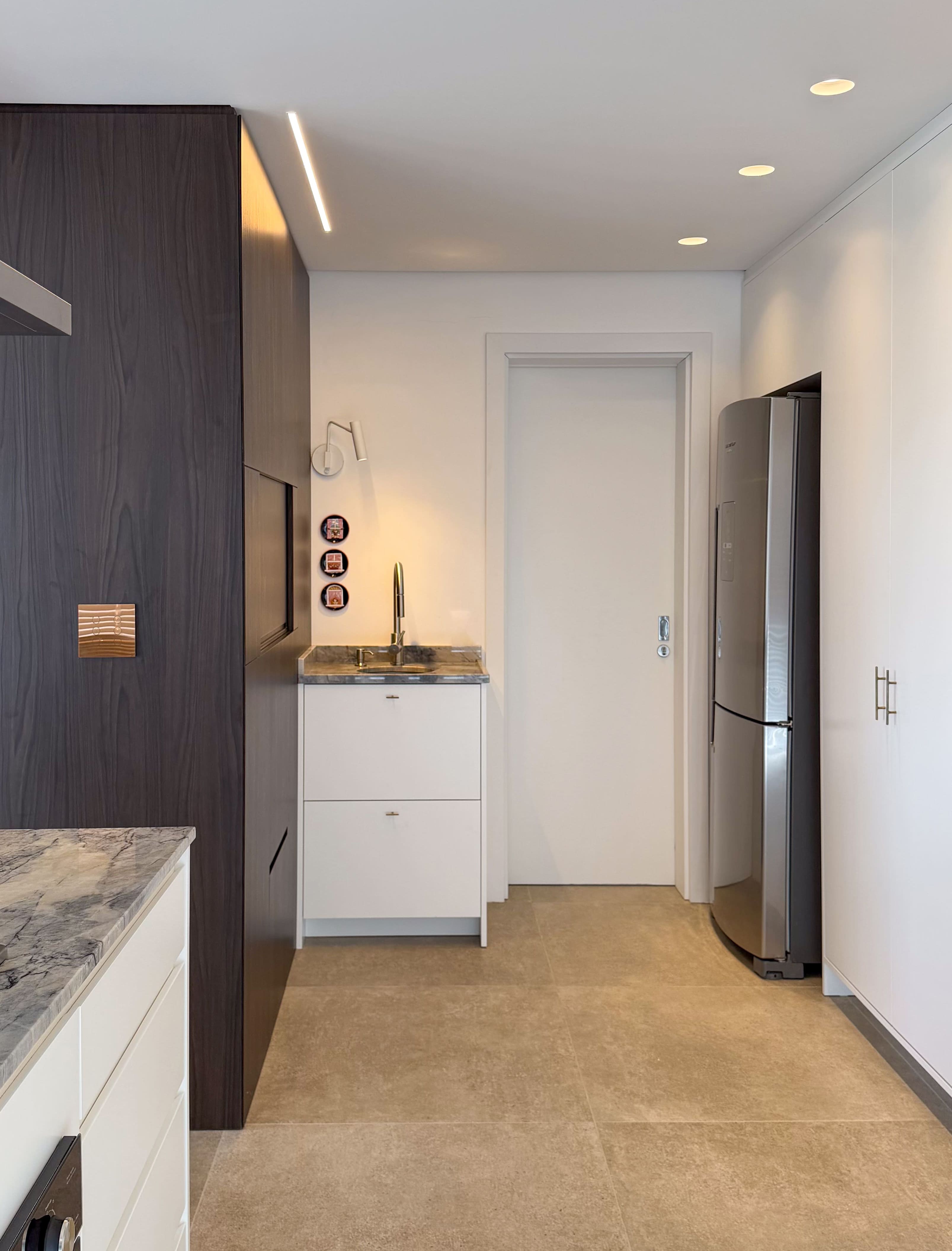 O espaço foi planejado para ser altamente funcional, aliando praticidade ao uso cotidiano a uma estética leve e equilibrada. A paleta de cores claras, combinada a texturas sutis e à mistura dos tons de madeira, cria uma composição harmônica e elegante, resultando em um ambiente contemporâneo, sofisticado e duradouro.