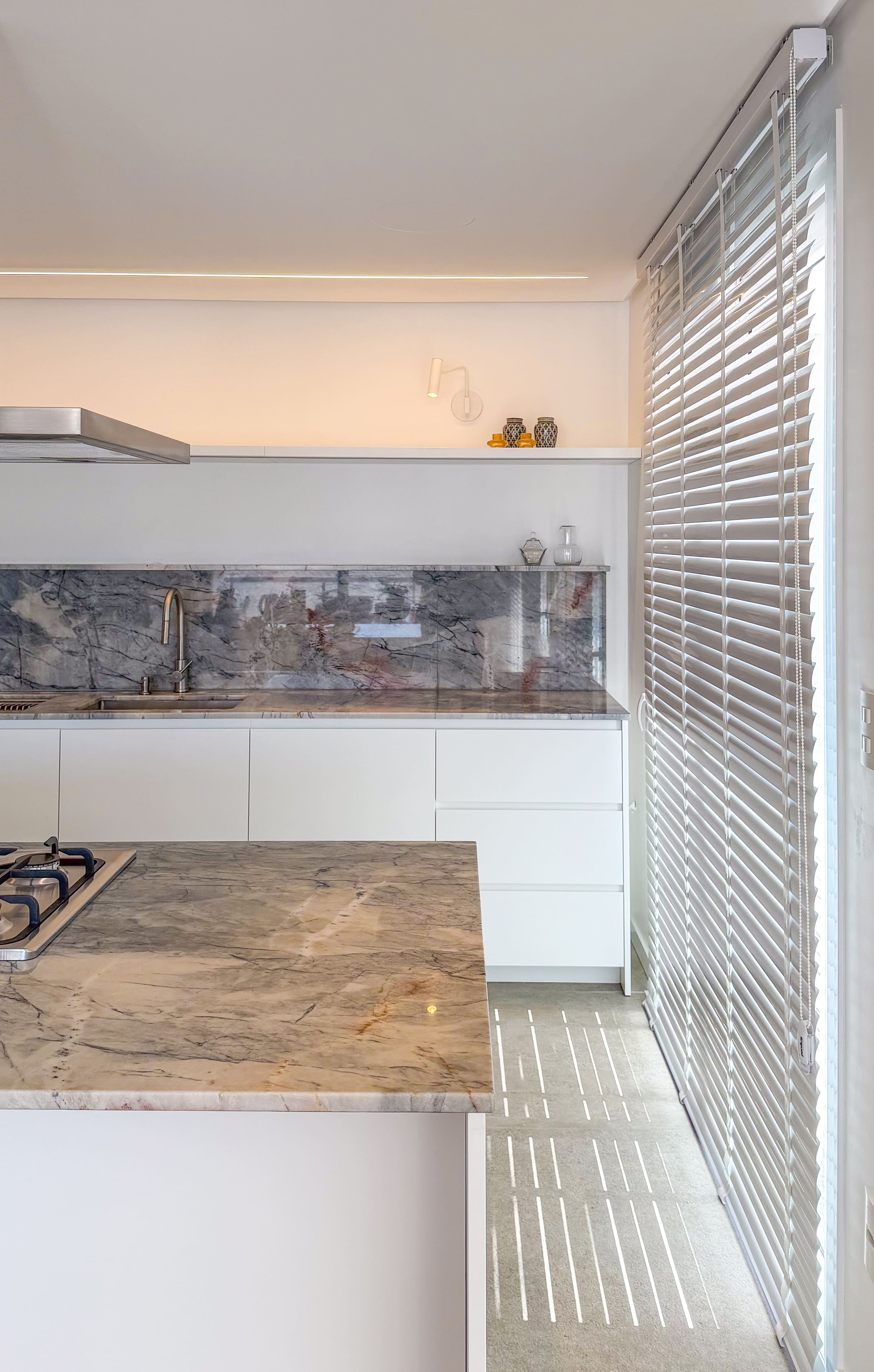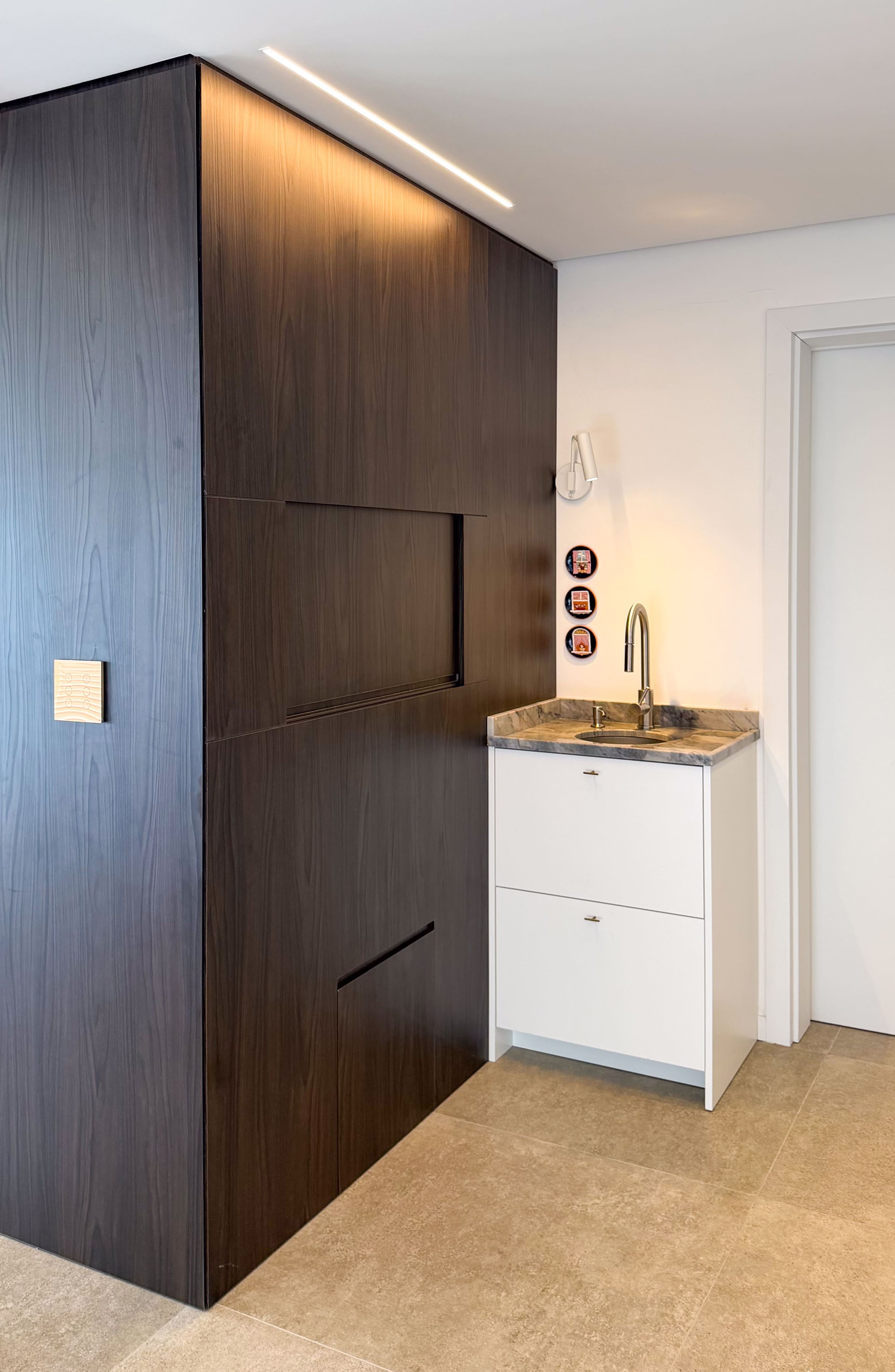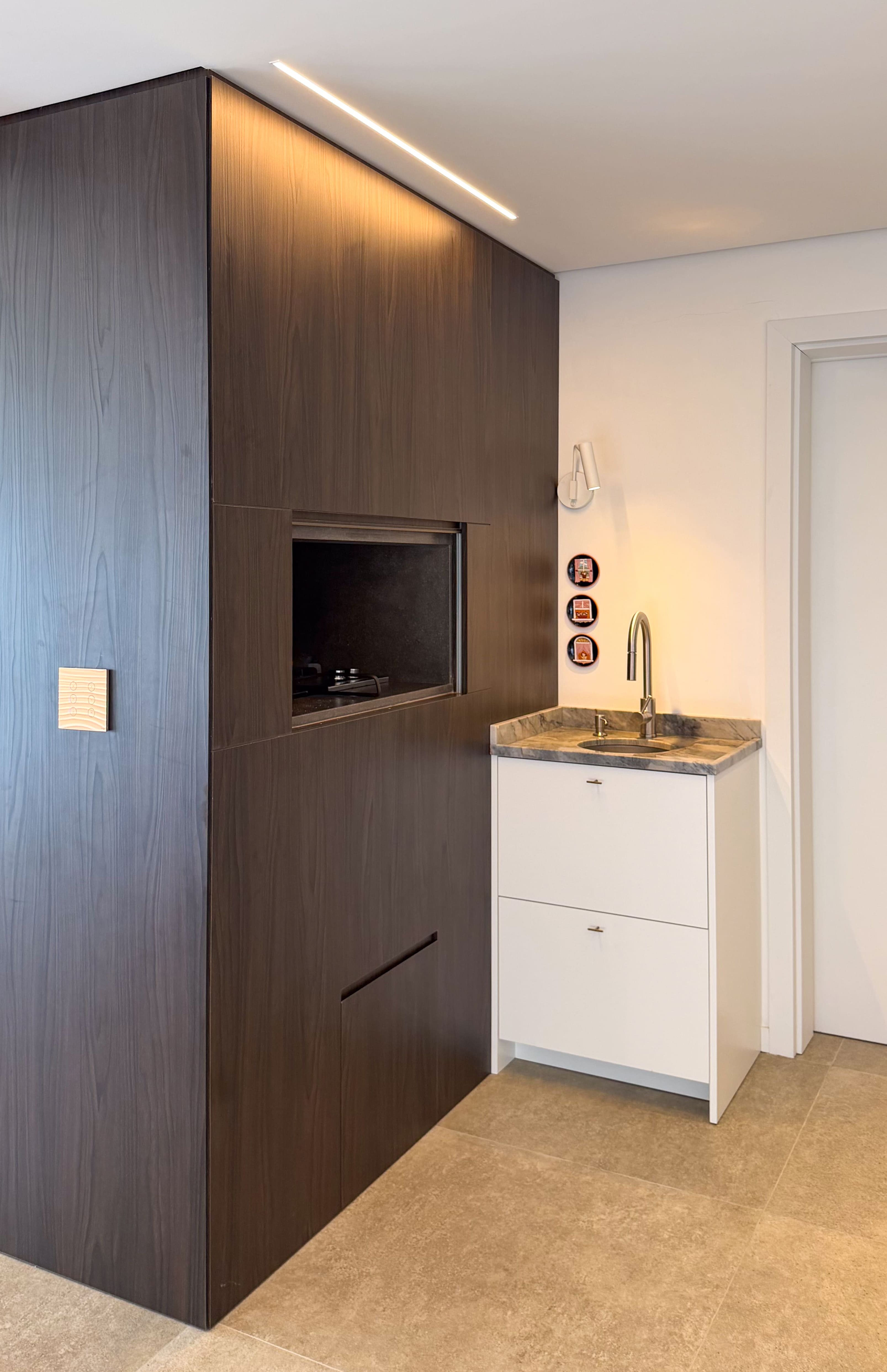 A escolha dos materiais, tons e materialidades foi desenvolvida de forma integrada, criando um conjunto coeso em que todos os ambientes da casa dialogam entre si.